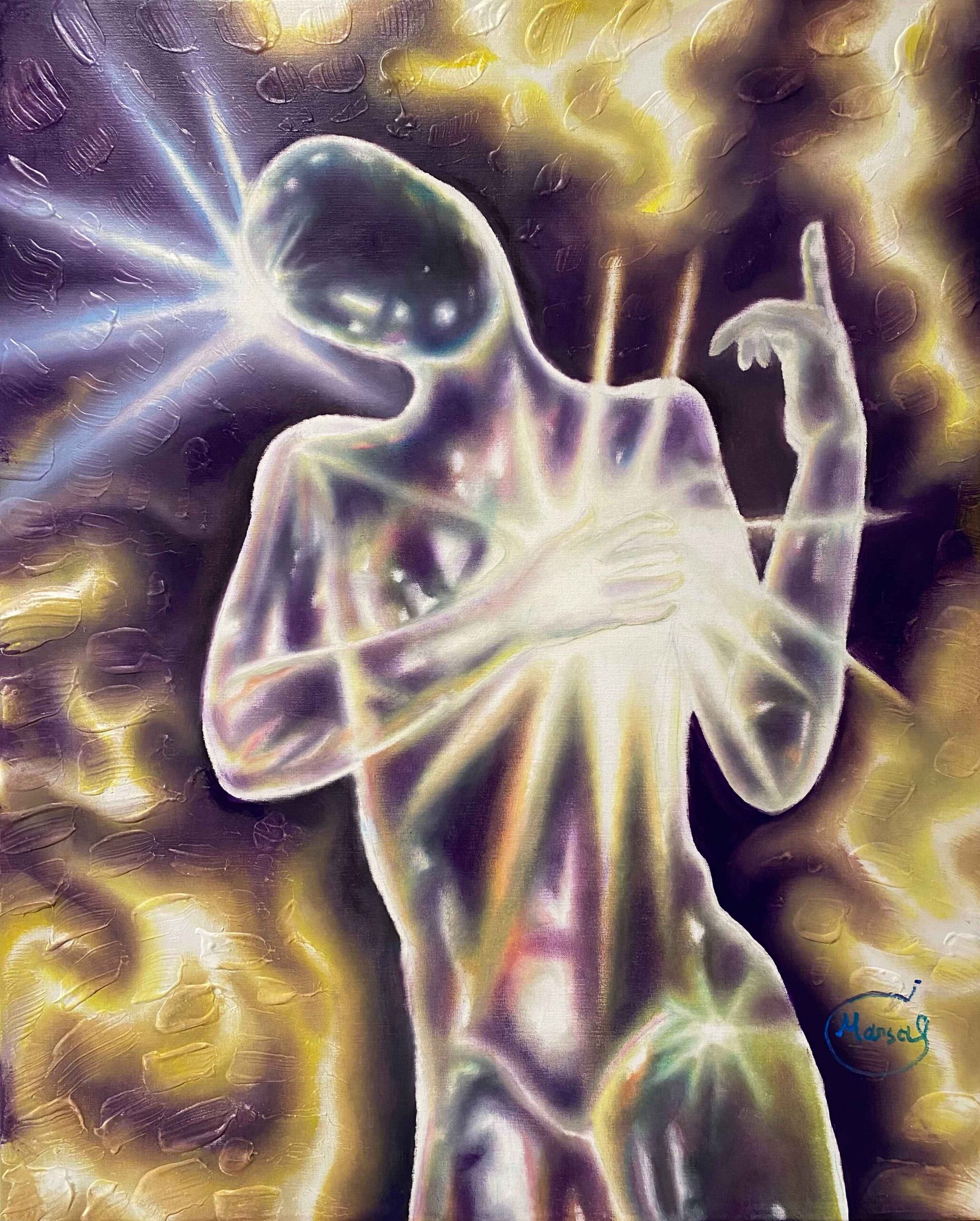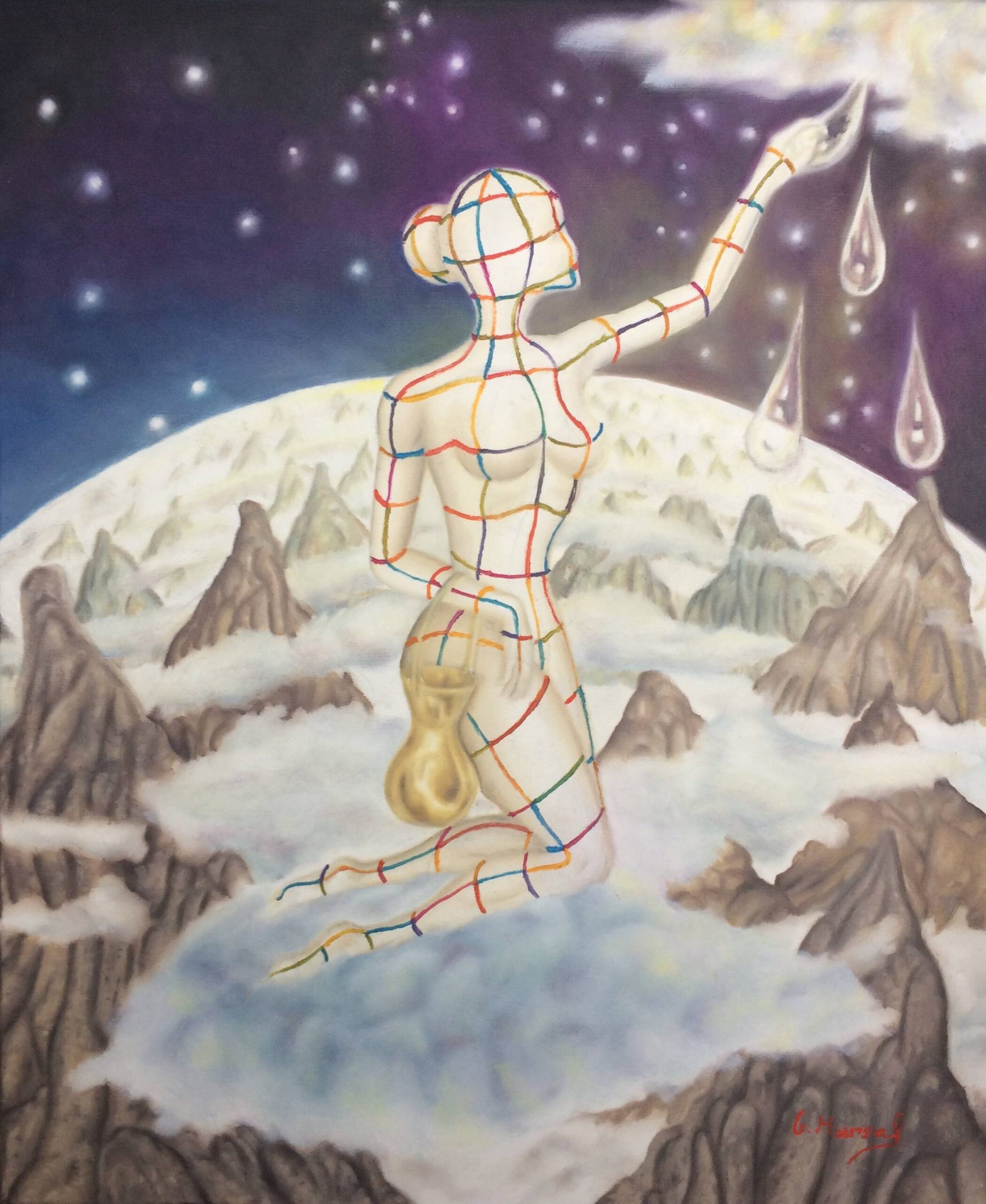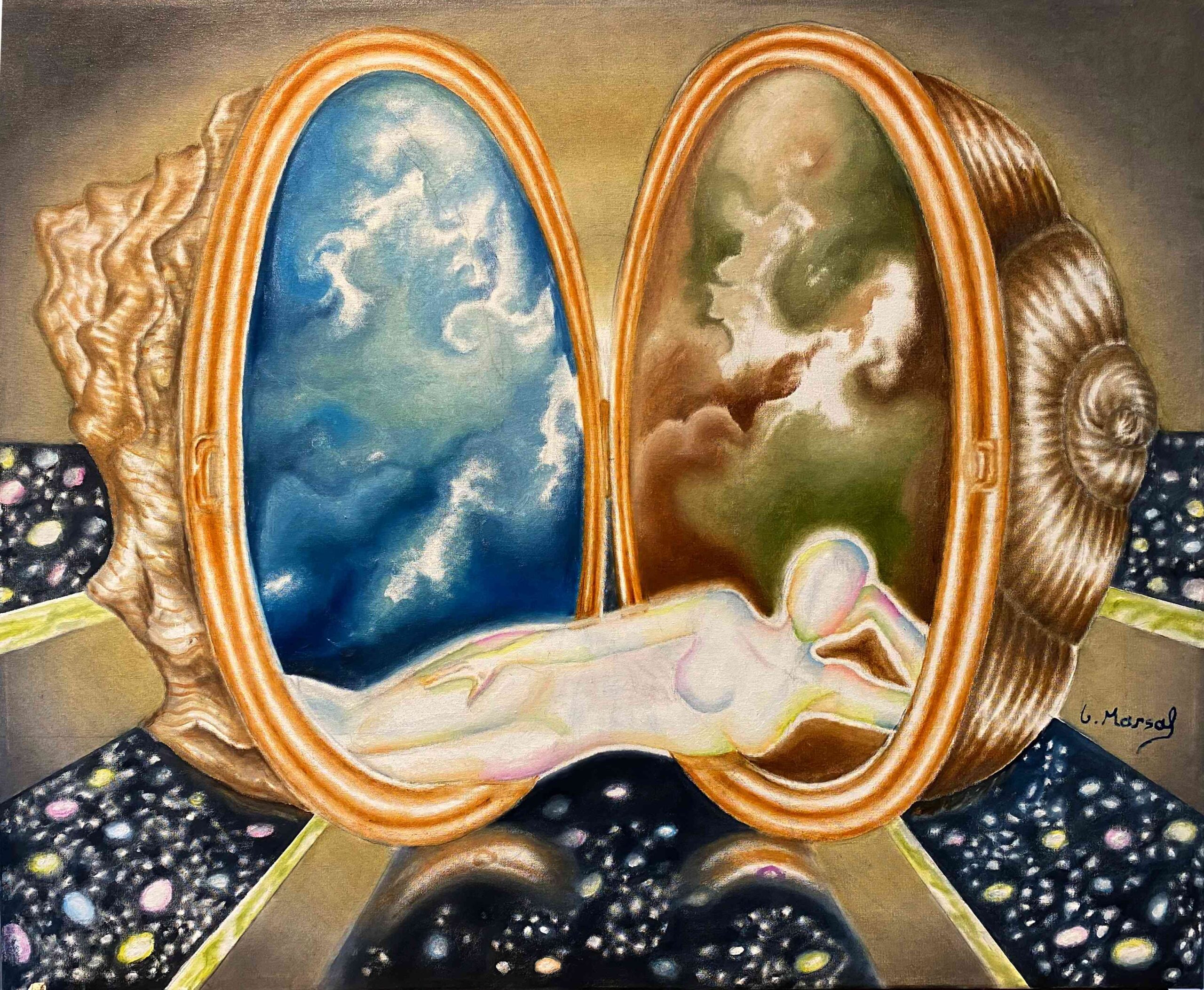 JOSEP GARCÍA MARSAL nace en Montblanc, Tarragona en 1982. Pintor onírico y narrador visual, entiende el arte como una forma de revelar lo invisible. Su obra nace de la emoción, la materia y una profunda conexión con el universo. Cada trazo es una historia, cada color un símbolo, y cada lienzo, una ventana a lo intangible. Estudió en la Escola d’Art de Tarragona y se graduó en Diseño Gráfico en la Llotja de Barcelona. Más tarde, se formó en pintura creativa en la Escola Massana, donde sus profesores descubrieron en él un talento natural. Paralelamente a la pintura, ha explorado la poesía y la narrativa, con un libro publicado: Las Musas. Su etapa actual, precisamente, la denomina Las Musas: tres seres simbólicos que lo inspiran y lo conectan con un mundo onírico lleno de luz y color. Así, define su arte como una forma de soñar despierto, una experiencia que trasciende lo visual. Un intérprete de la realidad, un canal para traducir lo eterno en lo sensible.