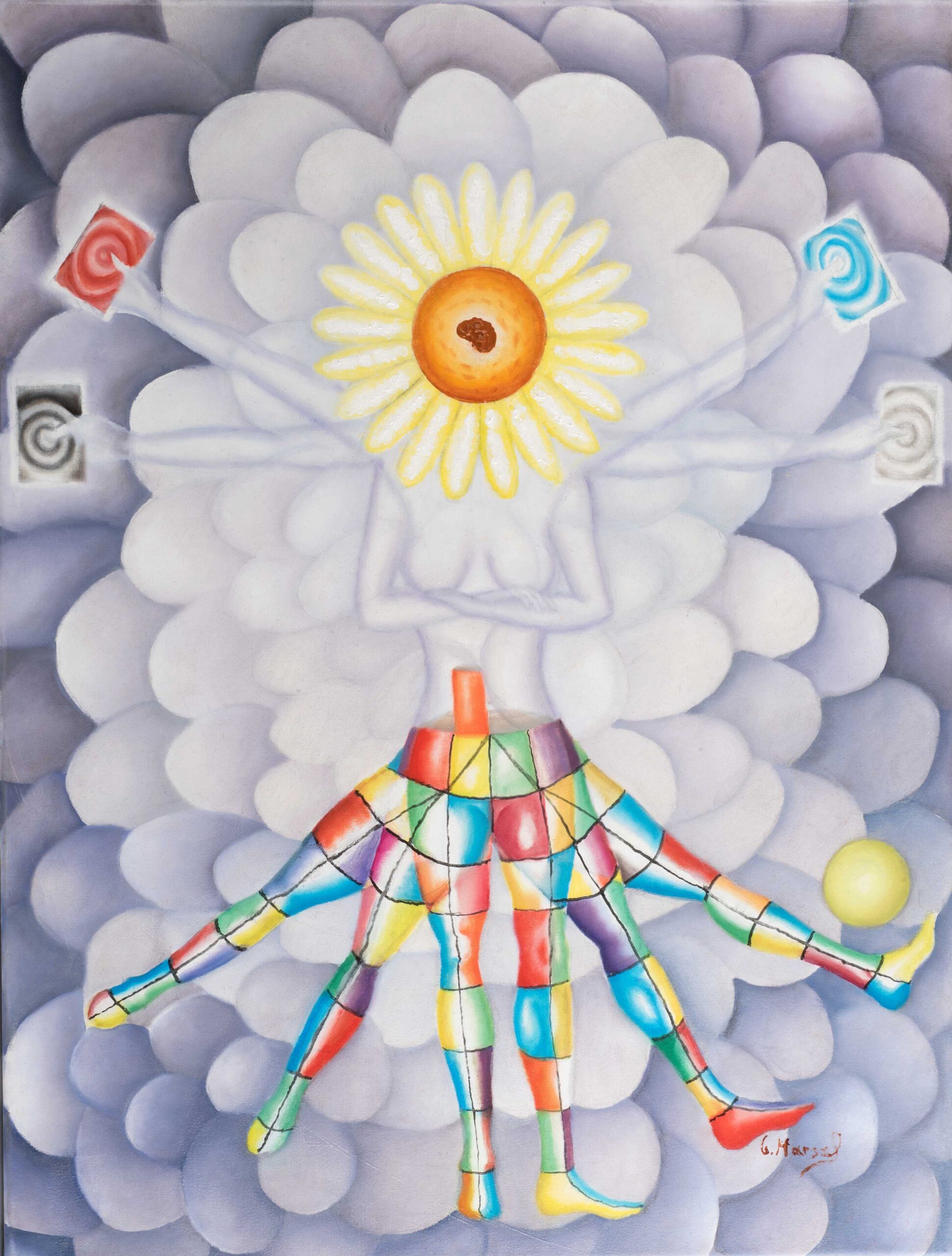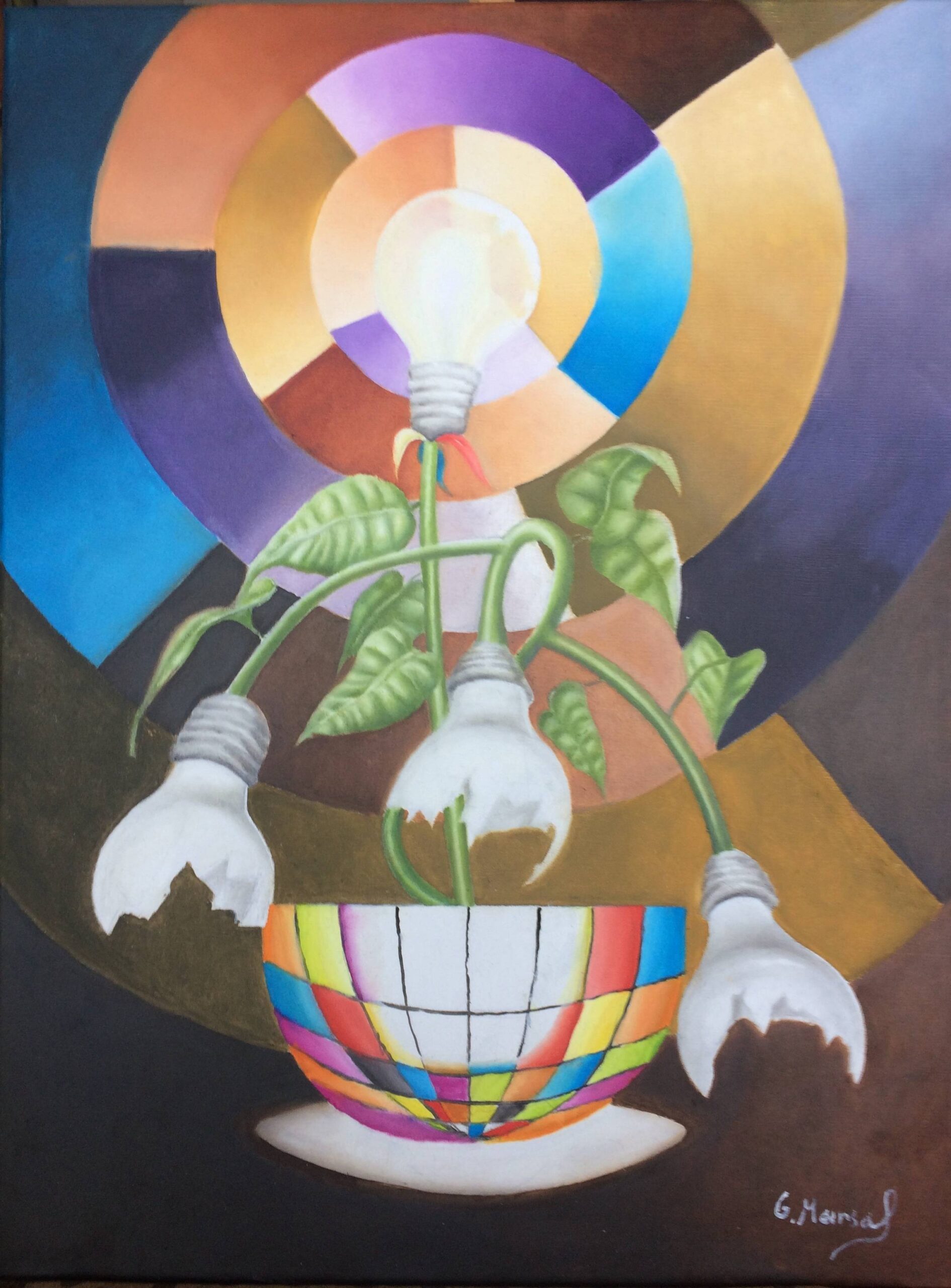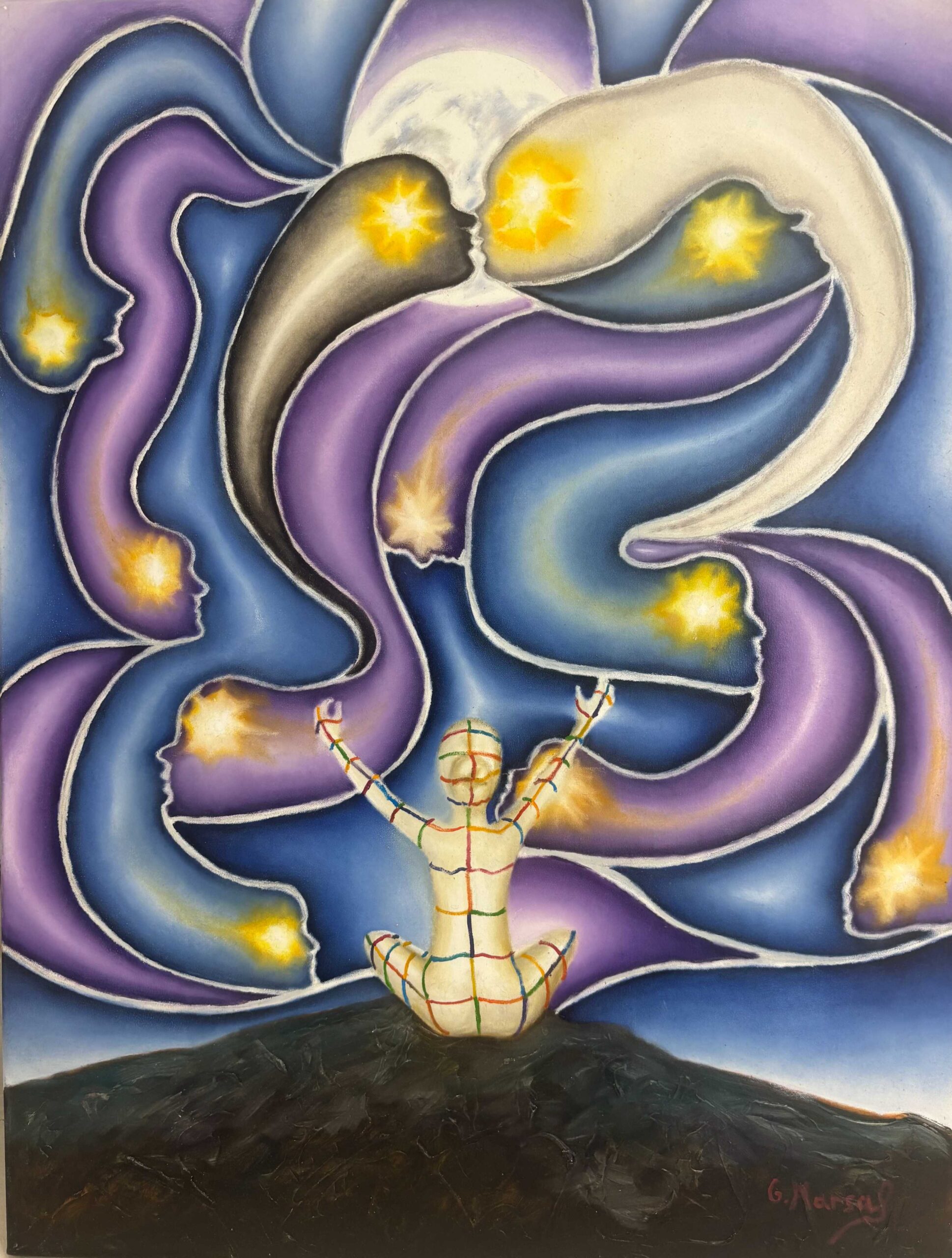 JOSEP GARCÍA MARSAL nace en Montblanc, Tarragona en 1982. Pintor onírico y narrador visual, entiende el arte como una forma de revelar lo invisible. Su obra nace de la emoción, la materia y una profunda conexión con el universo. Cada trazo es una historia, cada color un símbolo, y cada lienzo, una ventana a lo intangible. Estudió en la Escola d’Art de Tarragona y se graduó en Diseño Gráfico en la Llotja de Barcelona. Más tarde, se formó en pintura creativa en la Escola Massana, donde sus profesores descubrieron en él un talento natural. Paralelamente a la pintura, ha explorado la poesía y la narrativa, con un libro publicado: Las Musas. Su etapa actual, precisamente, la denomina Las Musas: tres seres simbólicos que lo inspiran y lo conectan con un mundo onírico lleno de luz y color. Así, define su arte como una forma de soñar despierto, una experiencia que trasciende lo visual. Un intérprete de la realidad, un canal para traducir lo eterno en lo sensible.